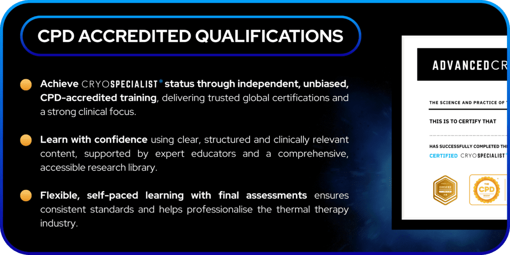 AdvancedCryo provides CPD certified thermal therapy courses, recognised as the industry’s highest standard of training.