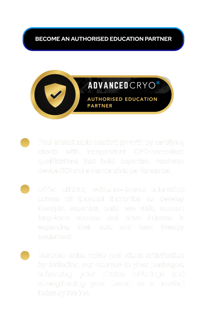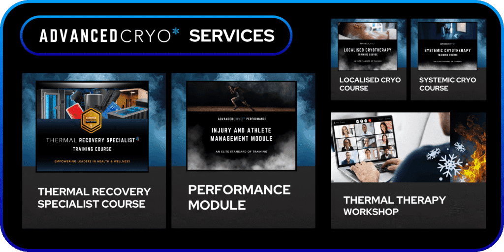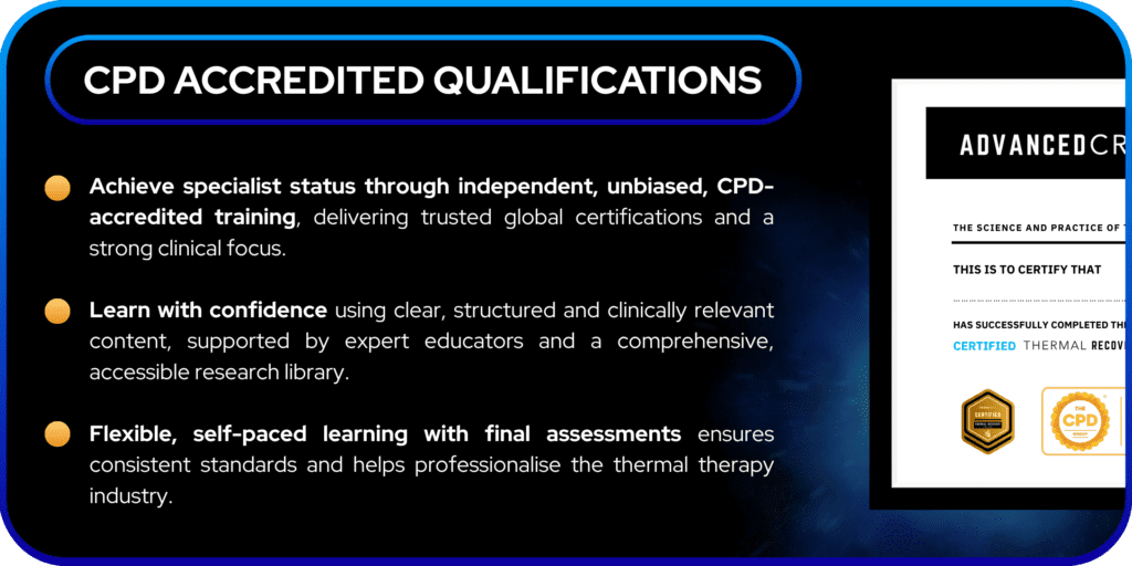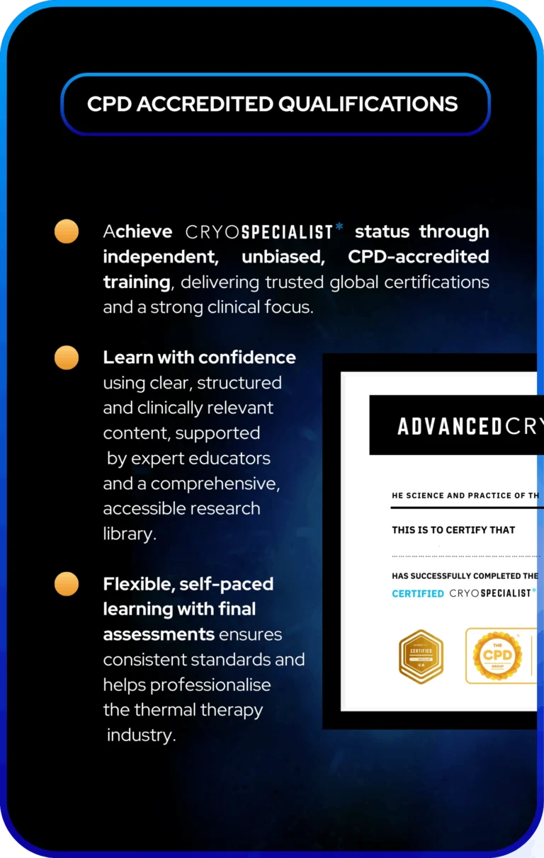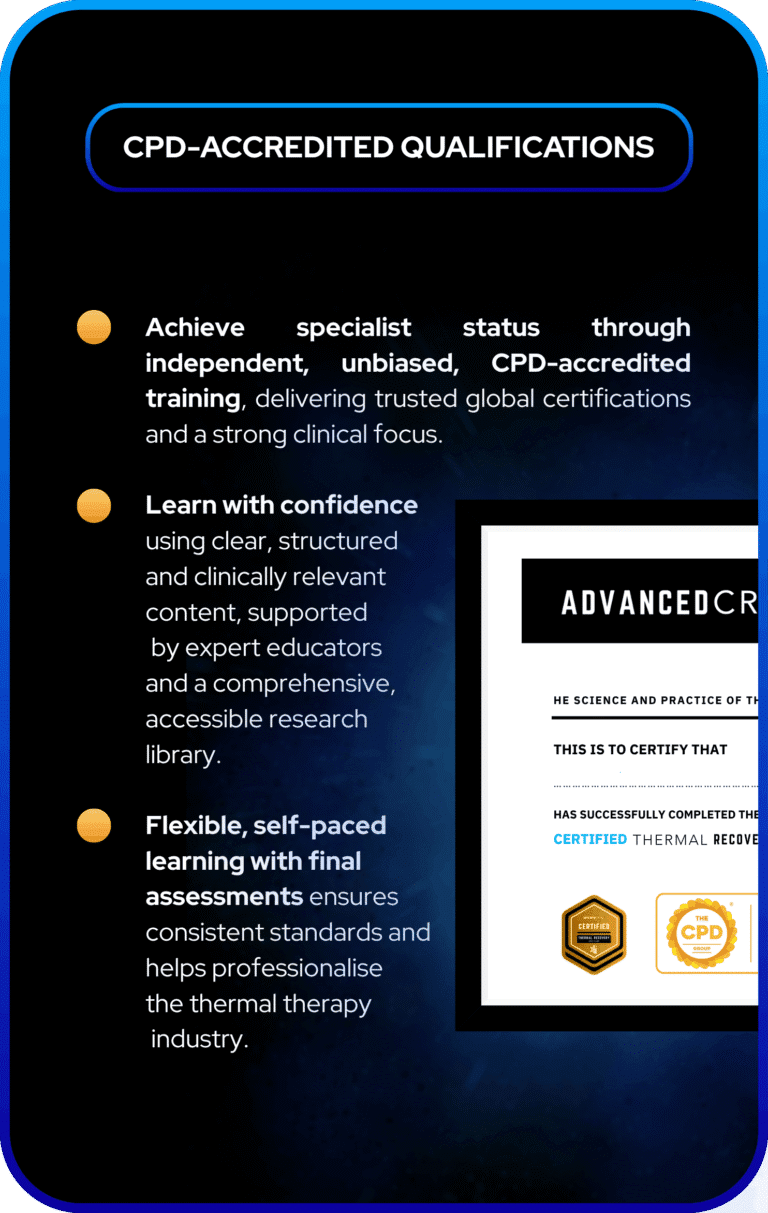 AdvancedCryo is a global education provider setting the recognised standard for thermal therapy training. We educate and qualify professionals to become recovery specialists, specialising in cold and heat therapy, equipping them to manage clients effectively and deliver individualised, evidence-based care across recovery, performance and wellness.